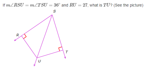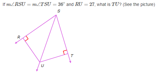 If m ∠ R S U = m ∠ T S U = 36 ∘ and R U = 27 , what is T U ? (See the picture)