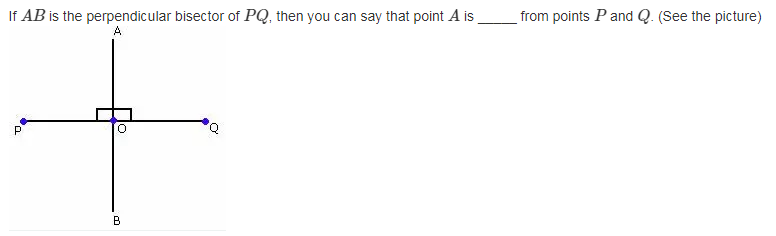If A B is the perpendicular bisector of P Q , then you can say that point A is _____ from points P and Q.