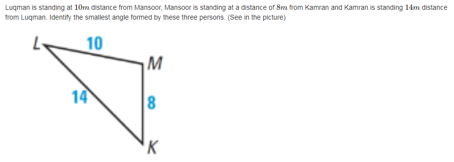 Luqman is standing at 10 m distance from Mansoor, Mansoor is standing at a distance of 8 m from Kamran and Kamran is standing 14 m distance from Luqman. Identify the smallest angle formed by the these three persons. (See in the picture).