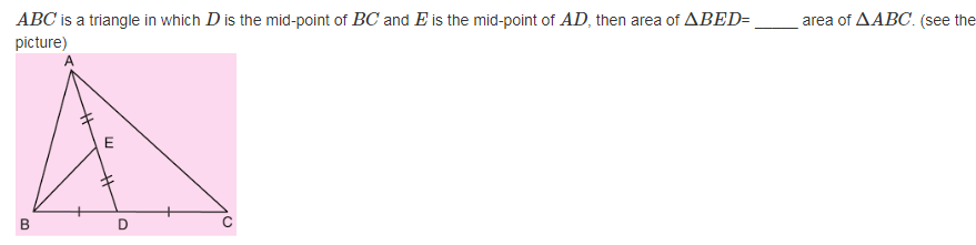 A B C is a triangle in which D is the mid-point of B C and E is the mid-point of A D , then area of Δ B E D = _____ area of Δ A B C . (see the picture)