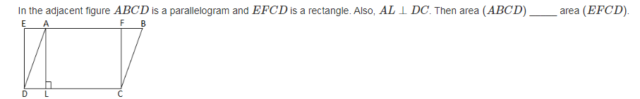 In the adjacent figure A B C D is a parallelogram and E F C D is a rectangle. Also, A L ⊥ D C . Then area ( A B C D ) _____ area ( E F C D ).
