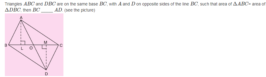 Triangles A B C and D B C are on the same base B C , with A and D on opposite sides of the line B C , such that area of Δ A B C = area of Δ D B C , then B C _____ A D . (see the picture).