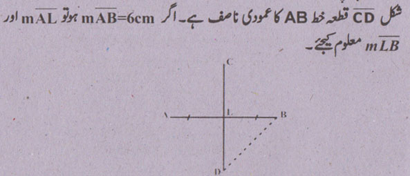 جواب نمبر 4 - ایک خط کسی قطعہ کا عمودی ناصف کہلاتا ہے-اگر قطعہ خط پر عمود بھی اور قطعہ پر عمود بھی ہو اور قطعہ خط کے وسطی نقطہ میں سے بھی گزرے-