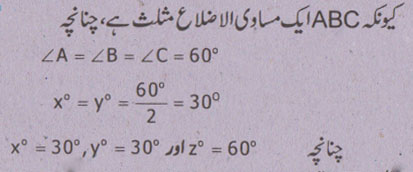 جواب نمبر 7 - کسی زاویے کی تنصیف سے مراد ہے کہ اس کو دو برابر حصوں میں تقسیم کرنا.اس لے لیے جو خط کھینچا جاتا ھے اسے زاویے کا ناصف کہا جاتا ہے.