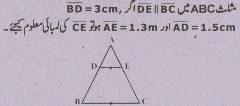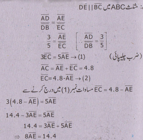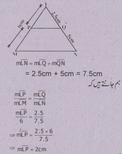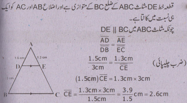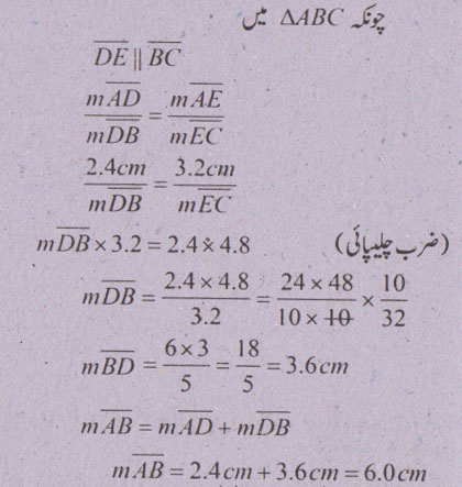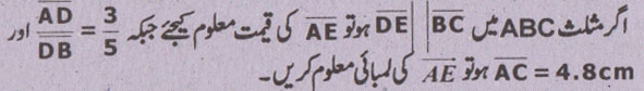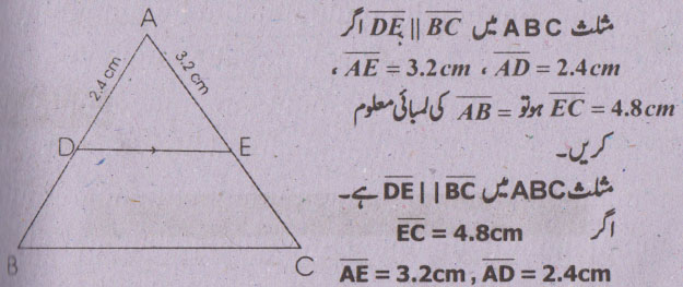 سوال نمبر 5 - اگر ایک قطعہ خط کسی مثلث کےدو اضلاع کو ایک ہی نسبت میں قطع کرے تو وہ تیسرے ضلع سے کیا تعلق رکھتا ہے؟