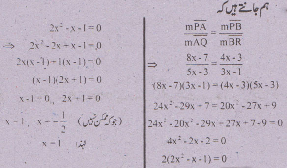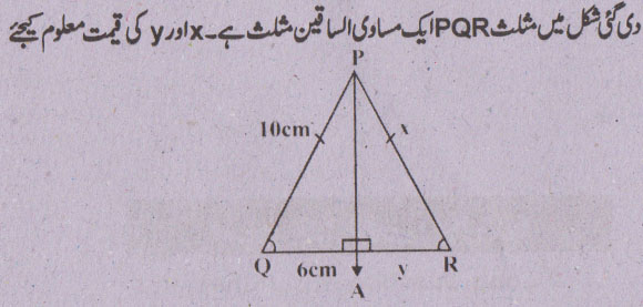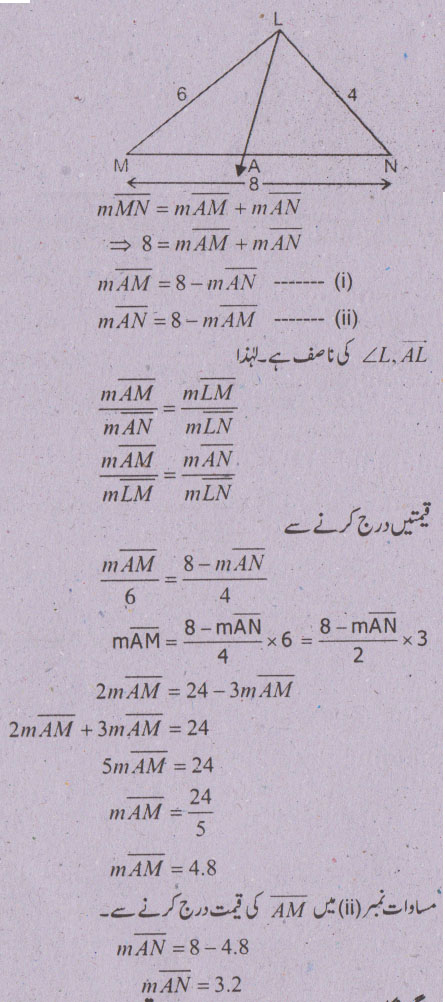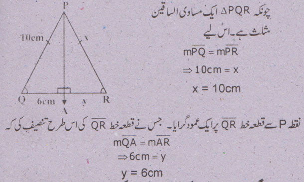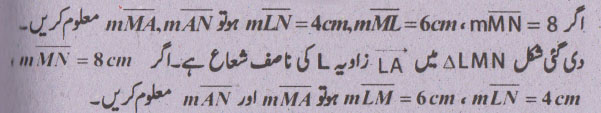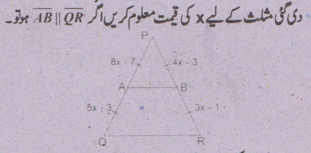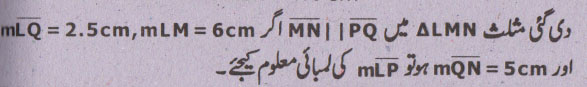 جواب نمبر 5 - اگر ایک قطعہ خط کسی مثلث کے دو اضلاع کو ایک ہی نسبت میں قطع کرے تو وہ تیسرے ضلع کے متوازی ہوگا اور لمبائی میں اس کا نصف ہو گا.
