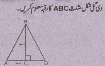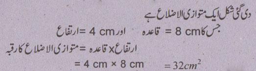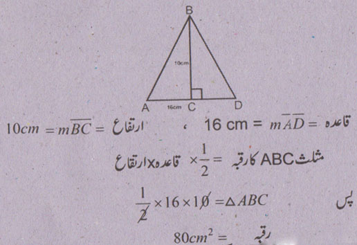 جواب نمبر 4 - اگر کسی مثلث کے ایک ضلع کو قاعدہ مان لیا جائے تو مخالف راس سے اس ضلع تک عمودی فاصلہ مثلث کا ارتفاع کہلاتا ہے.