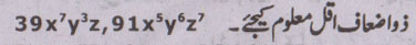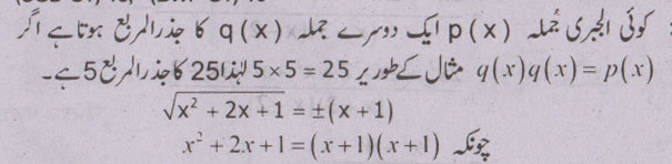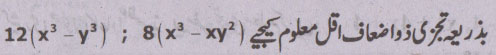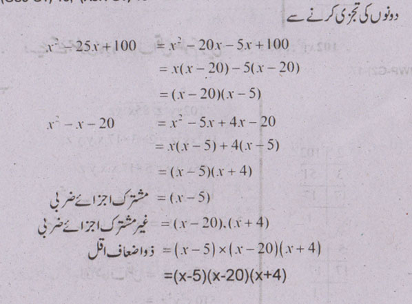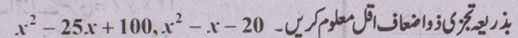 جواب نمبر 25 - ایک الجبری جملہ (P(x اگر دیے ہوئے دو یا دو سے زیادہ جملوں سے پورا تقسیم ہوتا ہو اور اُن کے مشترک اور غیر مشترک اجزائے ضربی کا چھوٹے سے چھوٹا حاصل ضرب ہوتو (P(x ان جملوں کا دو اضعاف اقل کہلاتا ہے.