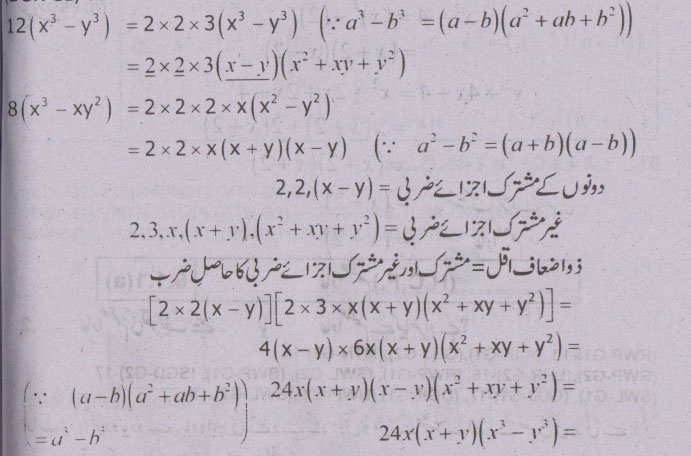 جواب نمبر 35 - دیے ہوئے الجبری جملوں کا ذواضعاف اقل معلوم کرنے کا عملی قانون. 1. دیے ہوئے جملوں کی سادہ ترین حد تک مکمل تجزی کریں. 2. ذواضعاف اقل چونکہ ہر جملہ کے اجزائے ضربی کا حاصل ضرب ہوتا ہے. اس میں اجزائے ضربی کی قوت نمائی کا خیال رکھا جاتا ہے.