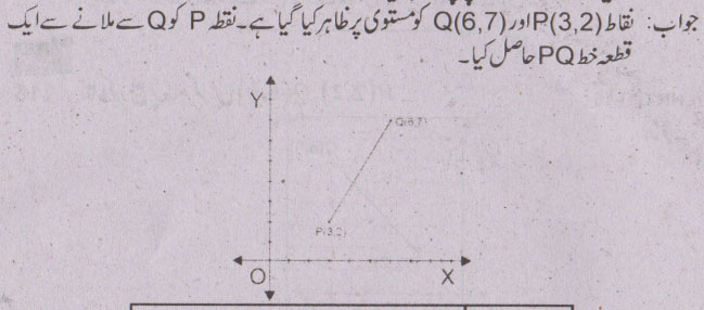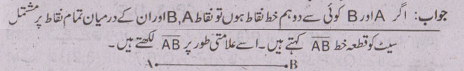 جواب نمبر 11 - اگر A اور B کوئی سے دو ہم خط نقاط ہوں تو نقاط B,A اور ان کے درمیان نقاط پر مشتمل سیٹ کو قطعہ خط کہتے ہیں.