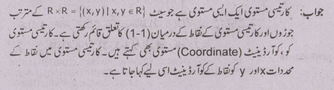 جواب نمبر 8 - کارتیسی مستوی ایک ایسی مستوی ہے جو سیٹ کے متر تب جوڑوں اور کارتیسی مستوی کے نقاط کے درمیان (1,-1)کا تعلق قائم رکھتی یے.کارتیسی مستوی کو کوارڈینیٹ مستوی بھی کہتے ہیں.